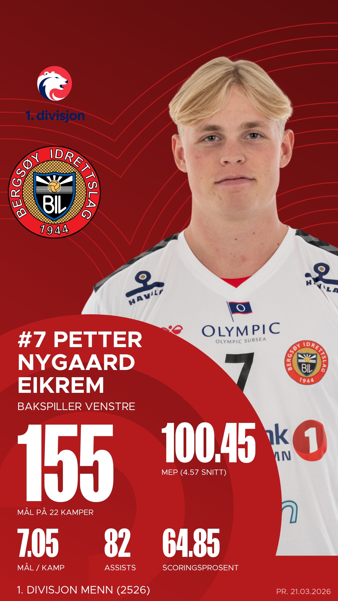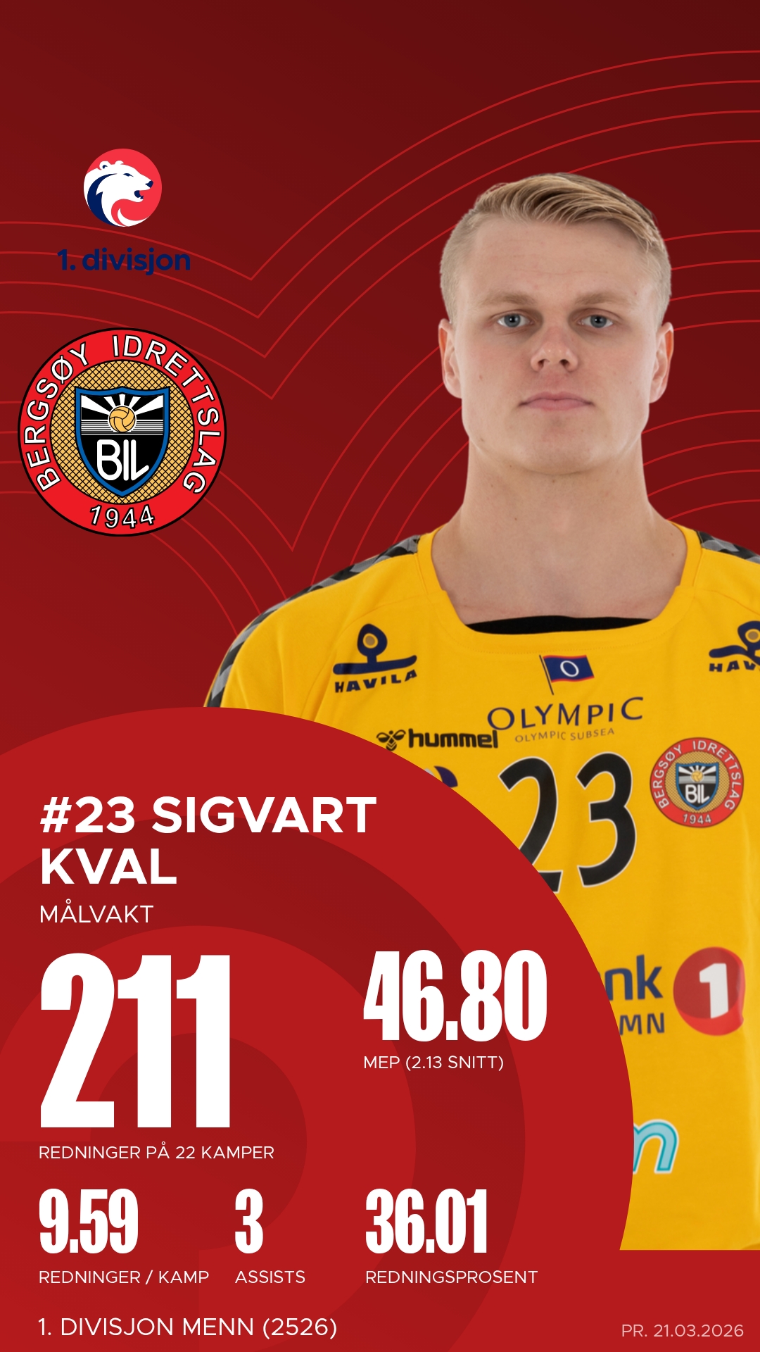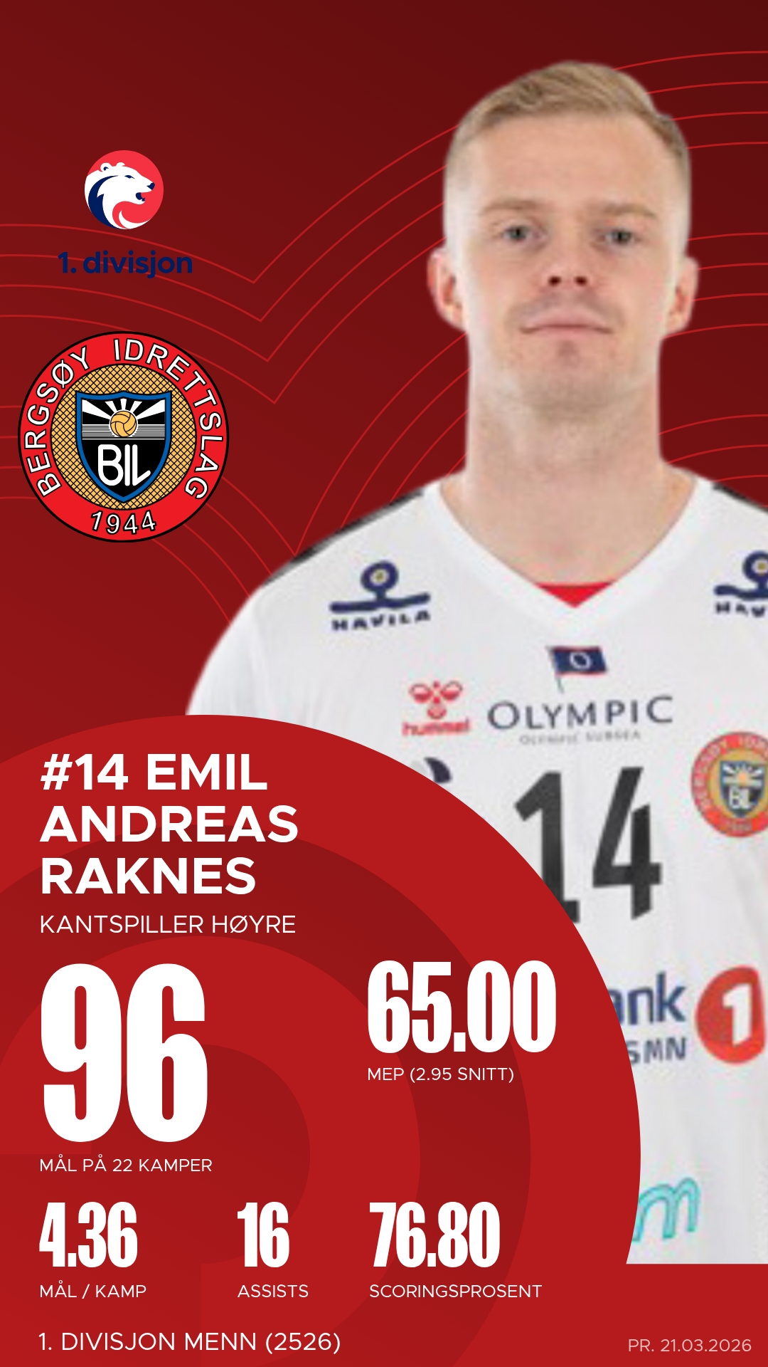 Bergsøy stiller med flere profiler som har vært toneangivende gjennom sesongen. Bakspiller Petter Nygaard Eikrem har vært lagets ubestridte motor, med over 150 scoringer og et imponerende antall assists. Markus Buchardt har levert på samme høye nivå med både mål og målgivende pasninger, og er en konstant trussel fra distanse. På kanten har Emil Andreas Raknes vært dødelig effektiv, med høy treffprosent og fart som skaper ubalanse i ethvert forsvar. Keeper Sigvart Kval har vært en trygghet bakerst, med over 200 redninger – en bauta som ofte redder laget når kampene står og vipper.